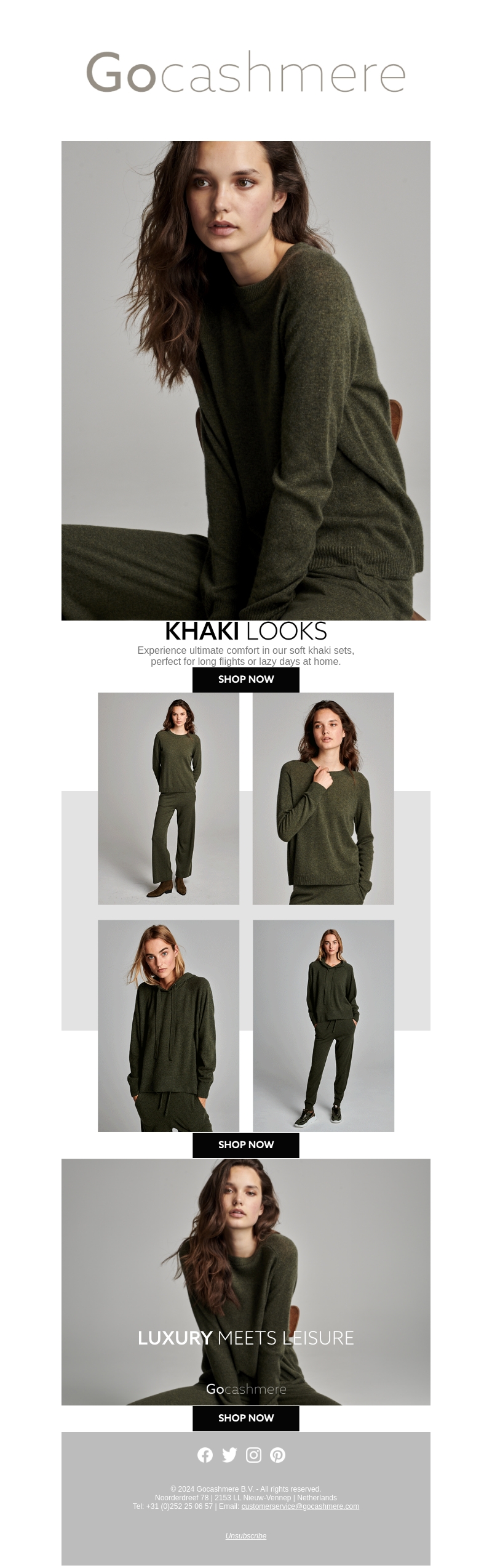 Ervaar ultiem comfort met onze zachte khaki sets van GoCashmere. Deze collectie is perfect voor lange vluchten of luie dagen thuis. Ontdek de nieuwste trends en geniet van luxe en stijl in elk moment van je dag. Shop nu en upgrade je garderobe met onze elegant ontworpen kledingstukken.