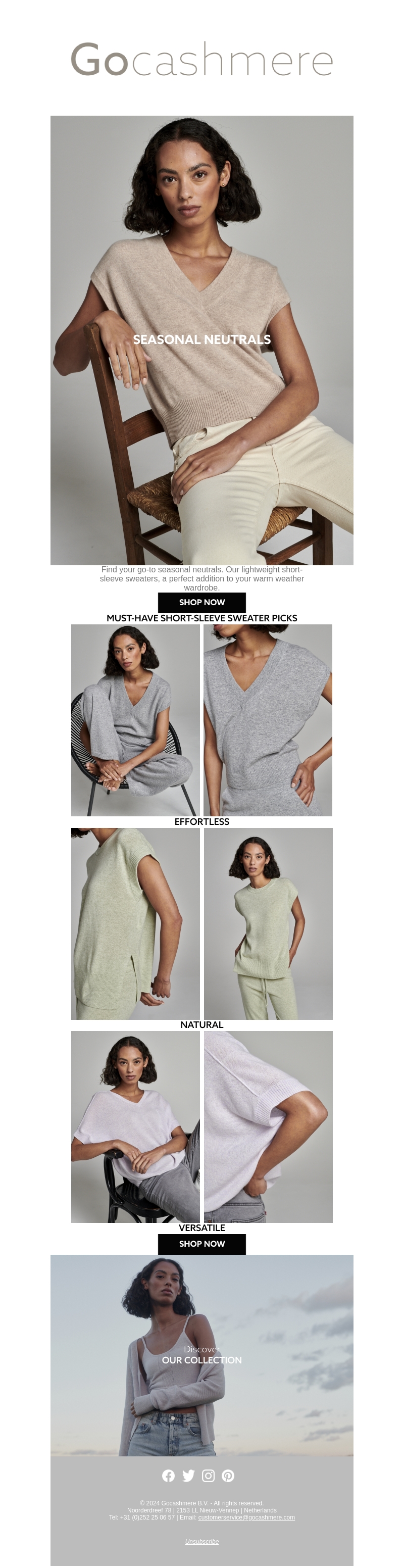 Vul je garderobe aan met de nieuwste seizoensgebonden neutrale truien van Gocashmere. Onze lichte truien met korte mouwen zijn perfect voor warm weer. Stijlvol, moeiteloos en natuurlijk.
