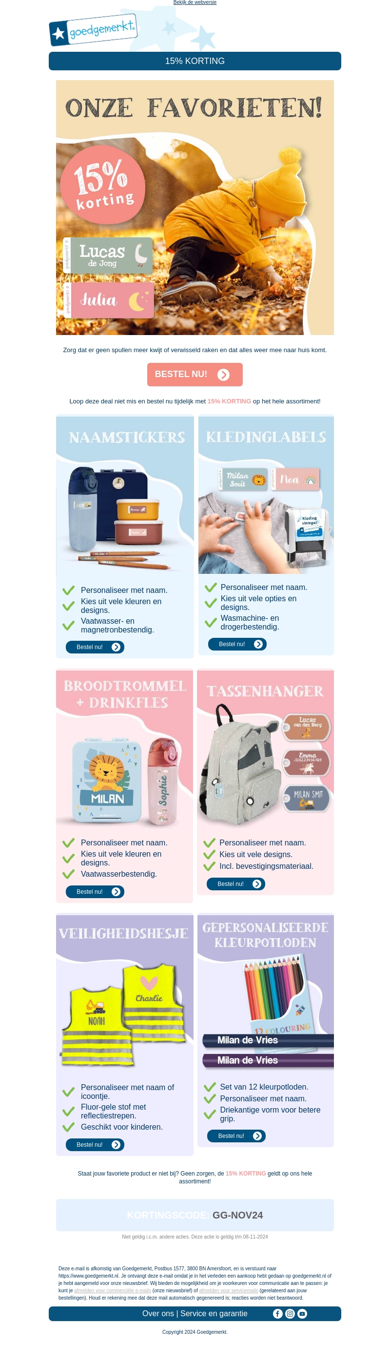 Profiteer nu van 15% korting op een selectie van onze favoriete producten. Van naamstickers tot gepersonaliseerde kledinglabels, er is voor ieder wat wils. Perfect voor kinderen en volwassenen, deze producten zijn vaatwasser- en wasmachinebestendig. Zorg ervoor dat alles met gemak terug naar huis komt door te personaliseren met namen en unieke ontwerpen. Mis deze speciale aanbieding niet en bestel vandaag nog!
