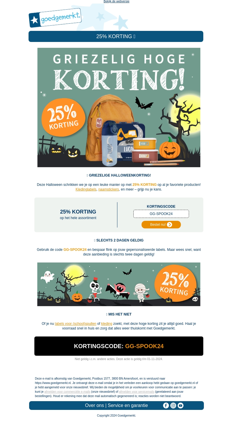 Beleef Halloween met een spannende korting van 25% op al je favoriete producten. Goedgemerkt biedt je de kans om kledinglabels, naamstickers en meer te kopen met deze tijdelijke aanbieding. Zorg dat je snel bent, want deze actie geldt slechts voor twee dagen. Gebruik de kortingscode GG-SPOOK24 bij je bestelling. Mis het niet en haal alles in huis wat je nodig hebt voor een onvergetelijk Halloween.