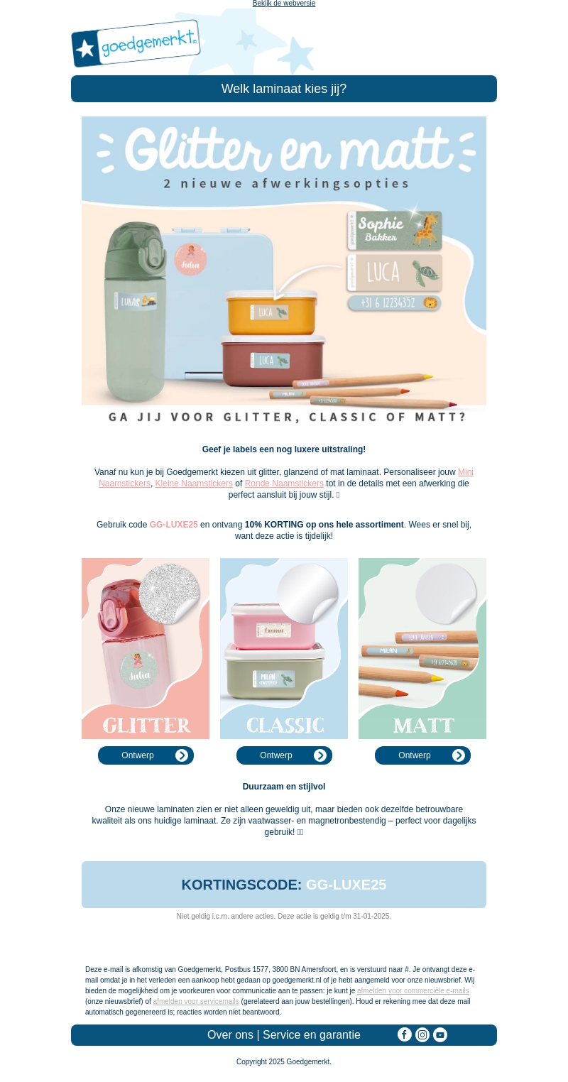 Goedgemerkt biedt nu labels met een nieuwe luxe uitstraling. Kies uit glitter of matte laminaten en personaliseer je mini naamstickers, kleine naamstickers of ronde naamstickers. Ontvang 10% korting op het hele assortiment met de code GG-LUXE25. Wees snel, de aanbieding is tijdelijk!