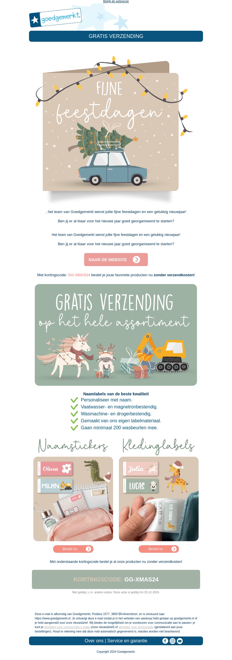 Doe mee aan onze feestelijke actie bij Goedgemerkt! Bestel nu je favoriete naamlabels en geniet van gratis verzending met de code GG-XMAS24. Onze labels zijn van topkwaliteit en speciaal gemaakt om wasbestendig te zijn. Mis deze kans niet om je aankopen op tijd voor de feestdagen in huis te hebben.