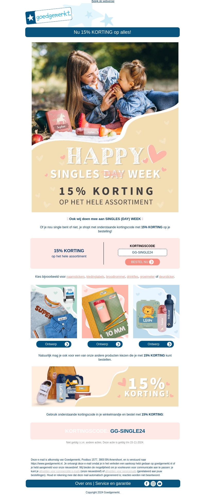 Vier Singles Day Week met 15% korting op het volledige assortiment van Goedgemerkt. Of je nu naamstickers, kledinglabels of drinkflessen nodig hebt, er is voor ieder wat wils! Gebruik de kortingscode GG-SINGLE24 op je bestelling. Mis deze kans niet om te profiteren van geweldige kortingen tijdens deze speciale week. De actie is geldig tot en met 15 november 2024.