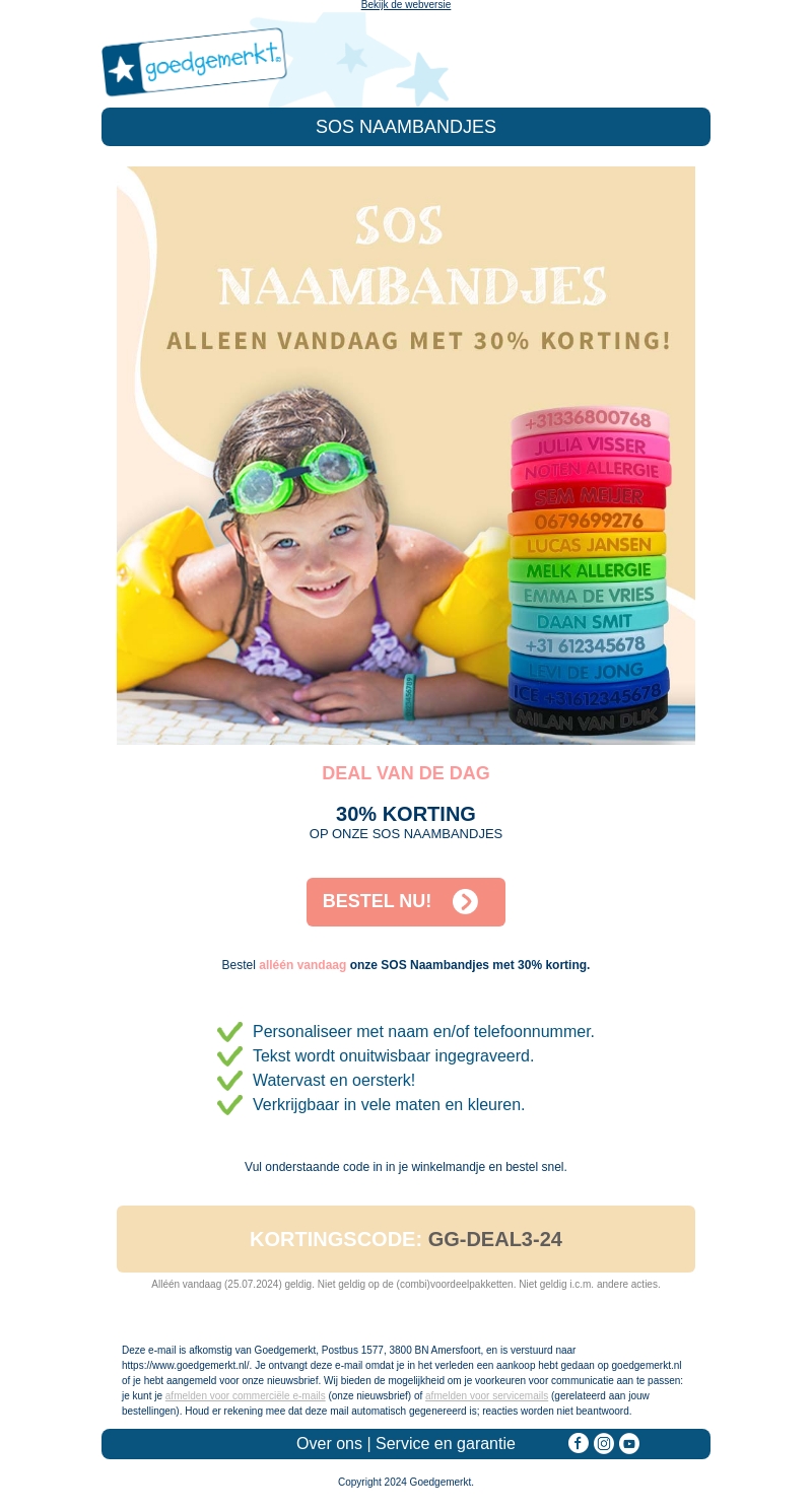 Alleen vandaag ontvangt u 30% korting op onze SOS Naambandjes. Deze water- en oesterkerke bandjes zijn personaliseerbaar met naam en/of telefoonnummer. Verkrijgbaar in vele maten en kleuren. Bestel ze nu voordelig en veilig bij Goedgemerkt.