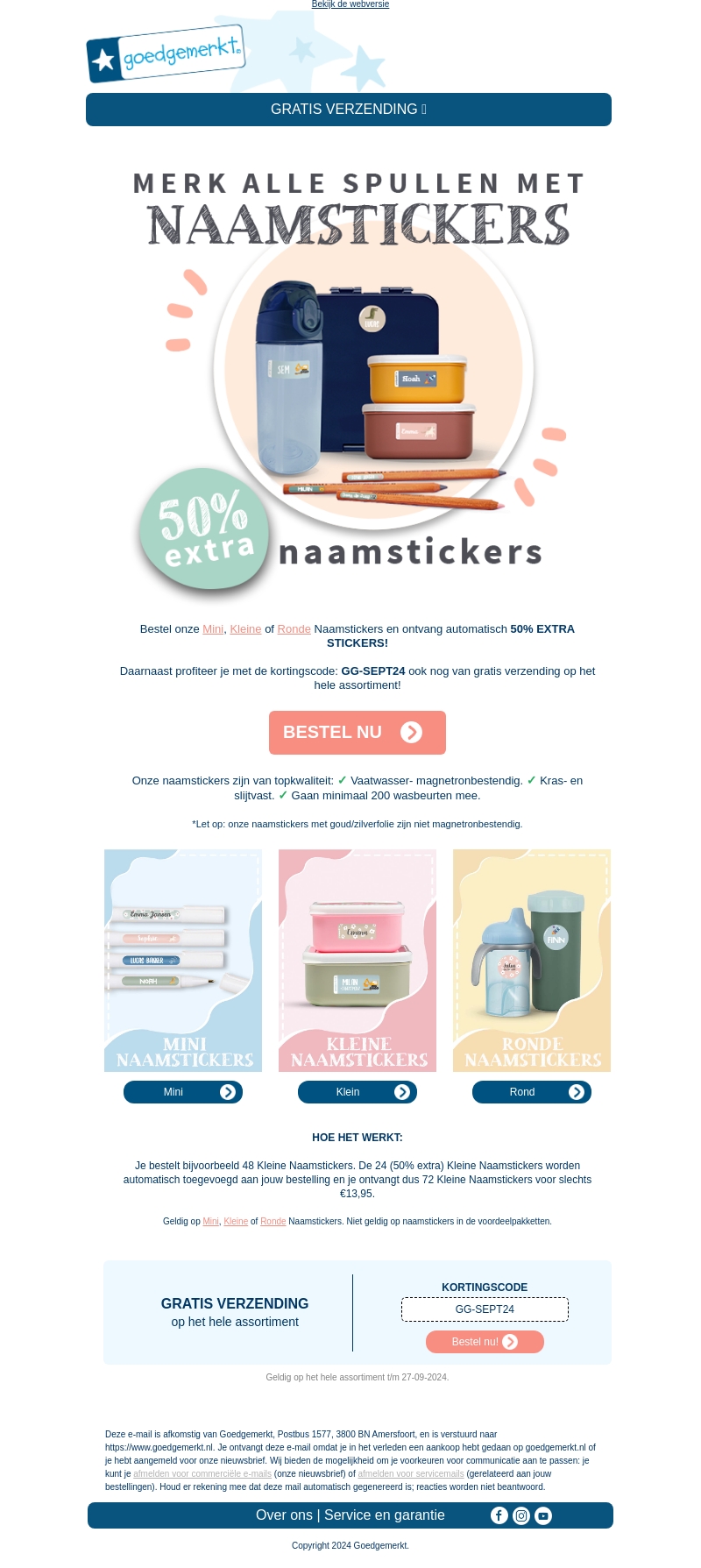 Bestel nu je Mini, Kleine of Ronde naamstickers en ontvang automatisch 50% extra naamstickers! Profiteer ook van gratis verzending met de kortingscode GG-SEPT24. Onze naamstickers zijn van topkwaliteit en geschikt voor diverse toepassingen.