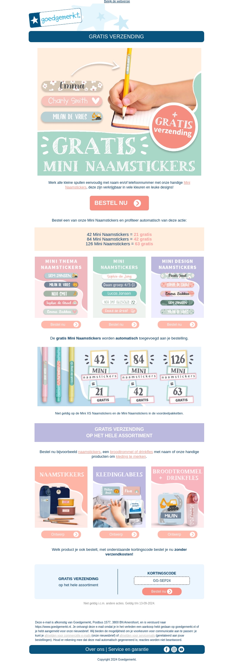 Ontvang nu gratis verzending op je hele bestelling bij Goedgemerkt en krijg gratis mini naamstickers. Markeer eenvoudig je spullen met onze schattige en handige mini naamstickers. Bestel vandaag nog en profiteer van deze geweldige aanbieding!