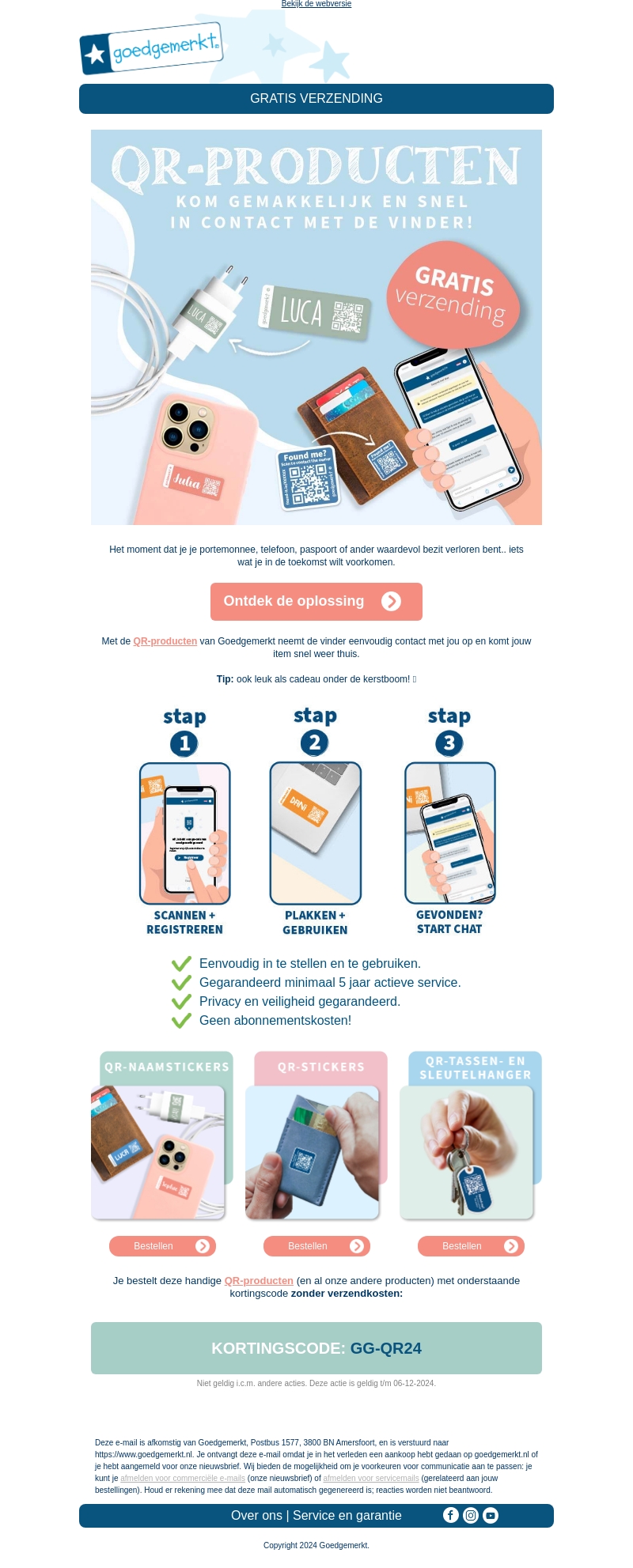 Maak kennis met de gebruiksvriendelijke QR-producten van Goedgemerkt! Deze innovatieve artikelen maken het mogelijk snel en veilig contact te leggen wanneer je waardevolle items kwijt bent. Met eenvoudige stappen zoals scannen en registreren, vind je jouw belangrijkste bezittingen snel terug. Met een actieve servicegarantie van minimaal 5 jaar blijf je verzekerd van gebruiksgemak. Ontdek de veelzijdigheid van QR-producten als ideaal cadeau of praktisch hulpmiddel.
