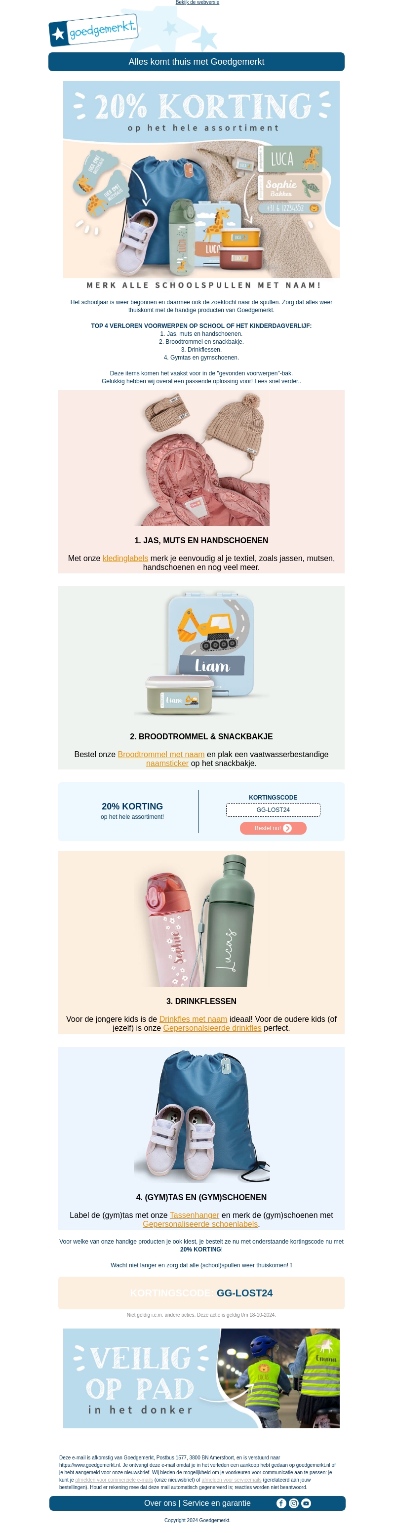 Mis deze kans niet om alles terug te vinden met onze handige producten van Goedgemerkt. Van kledinglabels voor jassen en mutsen, tot gepersonaliseerde drinkflessen en tassenhangers. Geniet van 20% korting op al je bestellingen. Gebruik de kortingscode GG-LOST24! Geldig tot 18-10-2024.