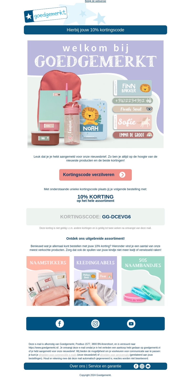 Welkom bij Goedgemerkt! We zijn blij dat je je hebt aangemeld voor onze nieuwsbrief. Profiteer nu van 10% korting op ons hele assortiment. Gebruik de unieke kortingscode GG-DCEVG6 bij je volgende bestelling. Ontdek onze naamstickers, kledinglabels en SOS naambandjes.