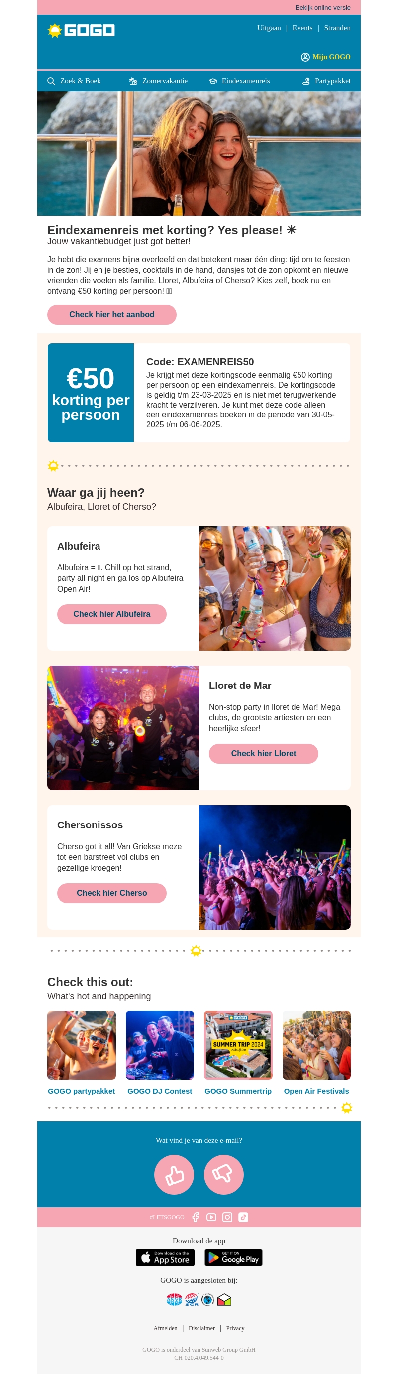 Bijna klaar met je examens? Vier je vrijheid met een onvergetelijke eindexamenreis. Ontvang nu €50 korting per persoon bij een boeking naar Albufeira, Lloret of Chersonissos. Geniet van zonnige stranden, feesten tot zonsopgang en onvergetelijke avonturen. Gebruik de kortingscode voor extra voordeel. Wacht niet te lang, boek vandaag nog je reis!