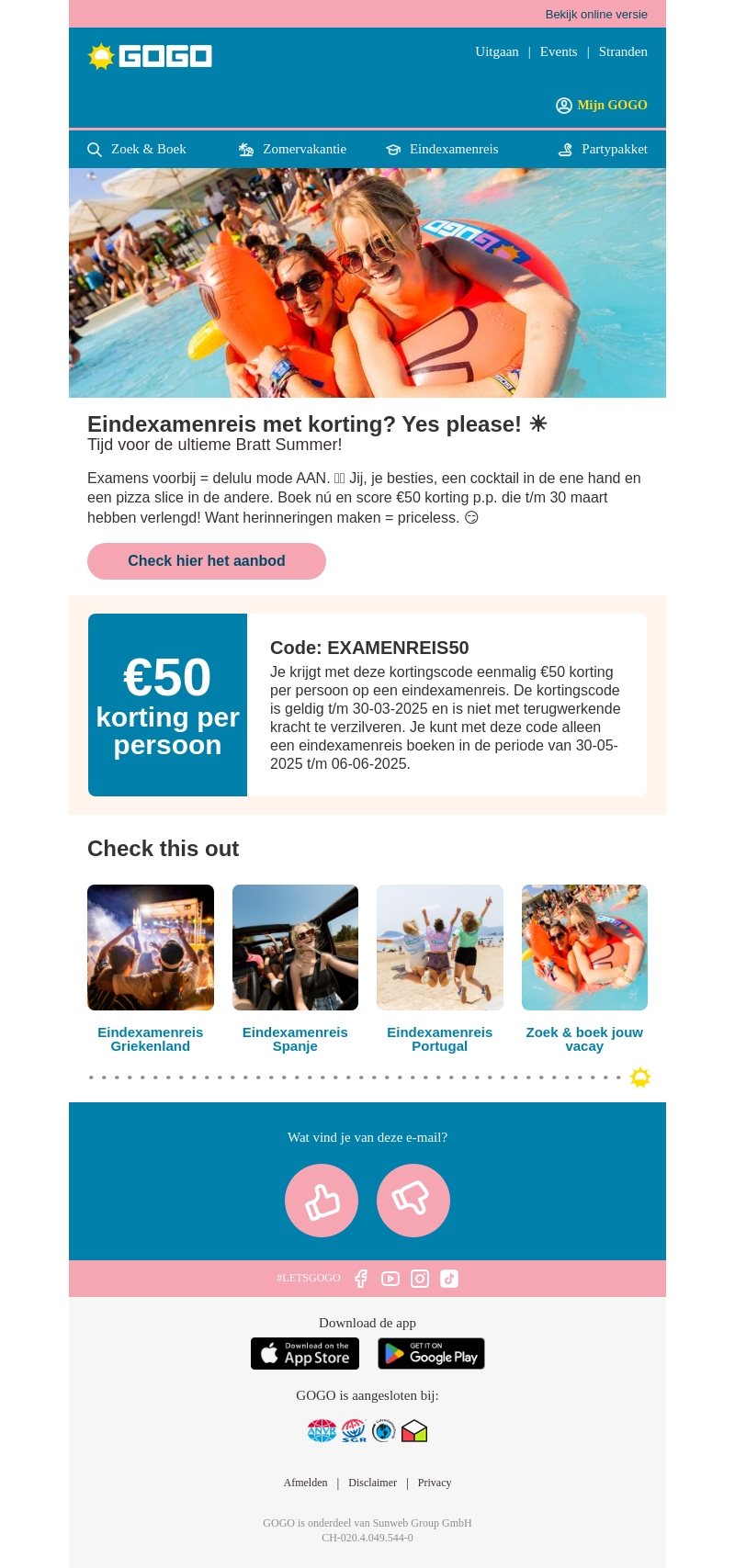 Eindexamenleerlingen opgelet! Grijp nu je kans om €50 korting per persoon te ontvangen op je eindexamenreis. Beleef de ultieme vakantie met je vrienden en geniet van de zon, zee en het strand. Boek snel en maak herinneringen die je nooit zult vergeten. Deze aanbieding is beperkt geldig, dus wacht niet te lang!