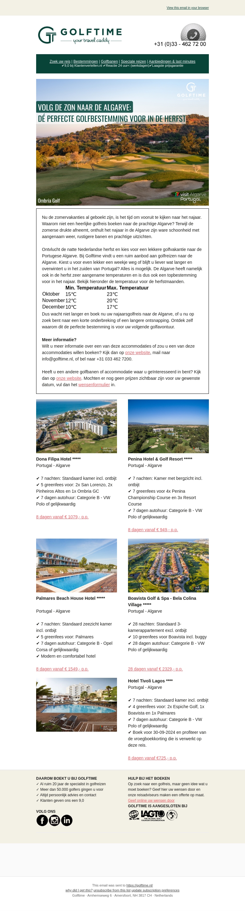 De zomer is voorbij, tijd om vooruit te kijken naar de herfst. Waarom niet een heerlijke golfreis naar de Algarve boeken? Met Golftime kunt u kiezen uit verschillende accommodaties en golfbanen, weg van de drukte en in een aangename temperatuur. Ontdek de perfecte bestemming voor uw volgende golfavontuur!