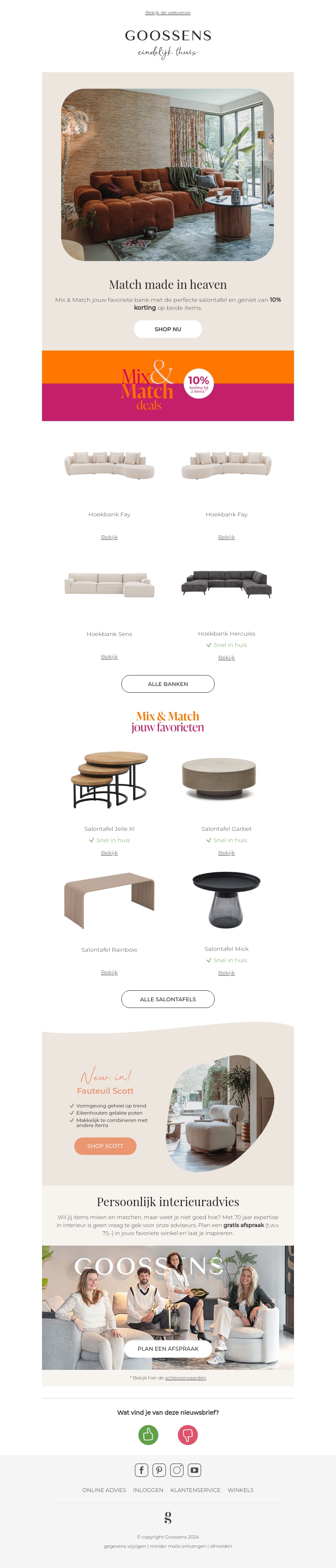 Mix & Match jouw favoriete bank met de perfecte salontafel en geniet van 10% korting op beide items. Of je nu op zoek bent naar een hoekbank of een stijlvolle salontafel, bij Goossens vind je het allemaal. Neem nu een kijkje en geef jouw zithoek een trendy upgrade.