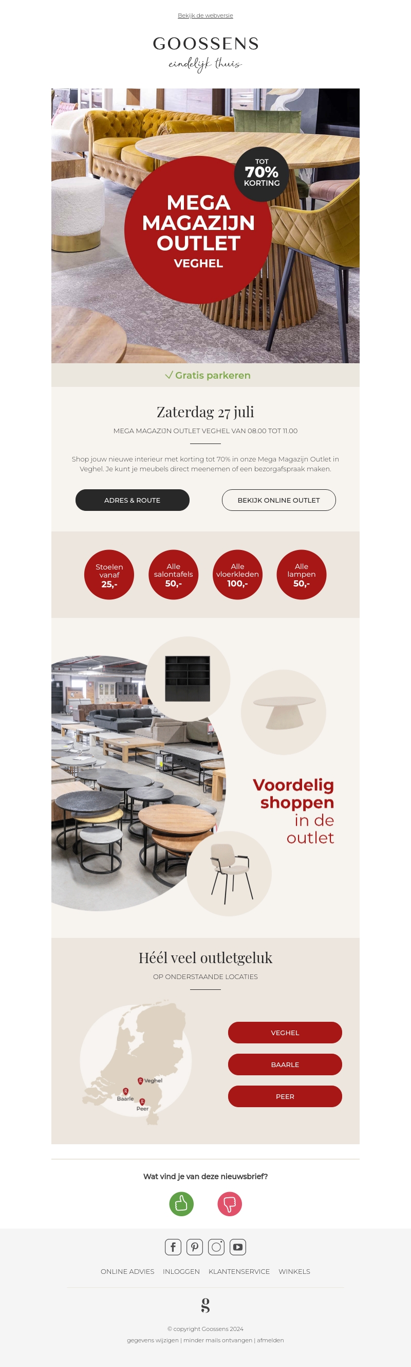 Ontdek de Mega Magazijn Outlet van Goossens in Veghel op zaterdag 27 juli. Geniet van kortingen tot 70% op een breed assortiment meubels, waaronder stoelen, salontafels, vloerkleden en lampen. Kom langs van 08:00 tot 11:00 en profiteer van deze geweldige aanbiedingen. Gratis parkeren is beschikbaar. Breng je eigen vervoer of maak een bezorgafspraak. Mis het niet!