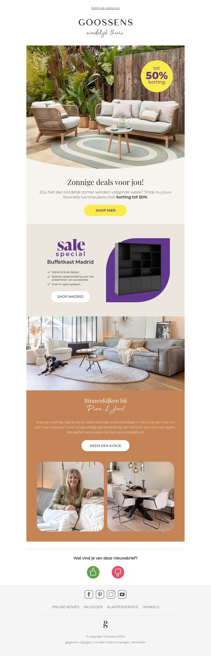 Profiteer van zonnige deals bij Goossens! Shop jouw favoriete tuinmeubels met kortingen tot 50%. Bekijk ook de sale special Buffekast Madrid met stijlvol design en speelse vakverdeling. Binnenkijken bij Pien & Jarl voor interieurinspiratie. Ontspan en geniet van jouw droominterieur.