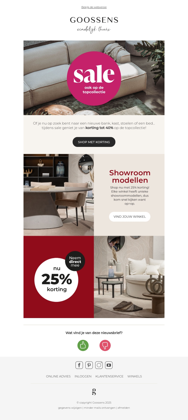 Profiteer van kortingen tot 40% op de topcollectie van Goossens. Of je nu op zoek bent naar een bank, kast, stoel of bed, dit is het moment om jouw favoriete meubel aan te schaffen. Daarnaast zijn er showroommodellen met 25% korting. Bezoek snel een van onze winkels en vind jouw nieuwe interieurstukken.