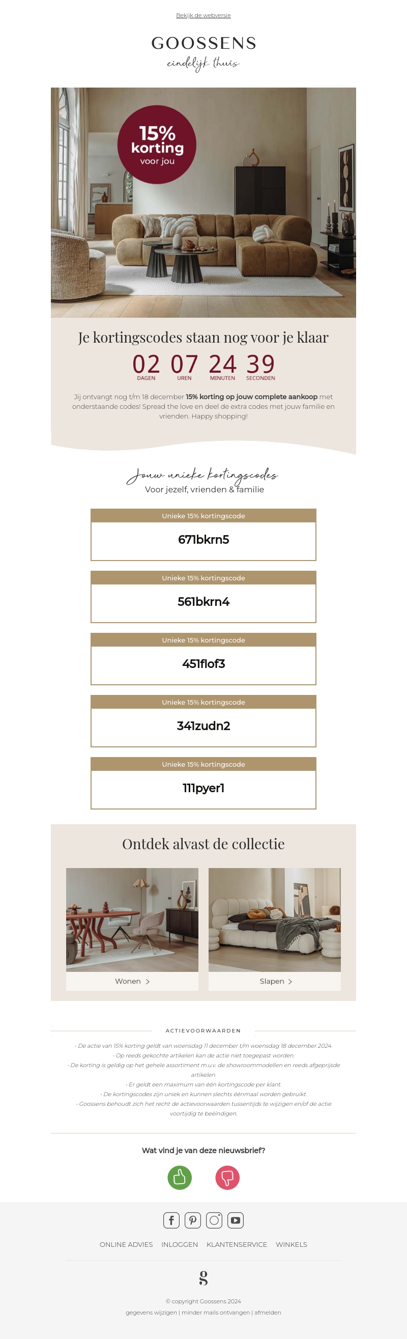 Ontvang een exclusieve 15% korting op je volledige aankoop bij Goossens. Deze aanbieding is geldig tot en met 18 december. Deel de kortingcodes met vrienden en familie. Bezoek onze collectie en ontdek de nieuwste trends voor wonen en slapen. Wees er snel bij, want de tijd tikt!