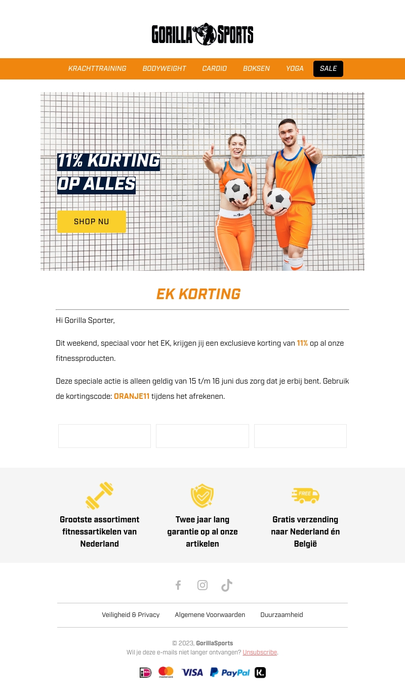 Dit weekend, speciaal voor het EK, krijg je 11% korting op alle fitnessproducten bij Gorilla Sports. Gebruik de kortingscode ORANJE11 tijdens het afrekenen. Geldig van 15 t/m 16 juni. Mis het niet!