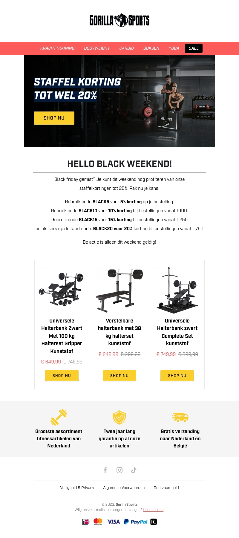 Mis Black Friday niet langer en ontdek nu het GorillaSports Black Weekend! Geniet van staffelkortingen tot wel 20% op een ruim assortiment aan fitnessartikelen. Gebruik de speciale kortingscodes BLACK5, BLACK10, BLACK15, en BLACK20 voor korting tot wel 20%. Deze aanbiedingen zijn slechts voor een beperkte tijd beschikbaar, dus pak je kans dit weekend!