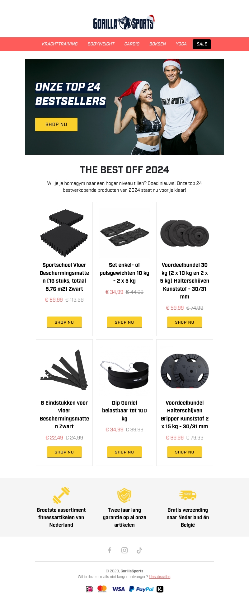 Til je homegym naar een hoger niveau met de top 24 bestsellers van Gorilla Sports voor 2024. Geniet van kortingen op essentiële fitnessapparatuur zoals vloerbeschermingsmatten, gewichtensets en halterschijven. Profiteer van gratis verzending naar Nederland en België. Ontvang bovendien twee jaar garantie op alle artikelen. Mis deze speciale kerstdeals niet!