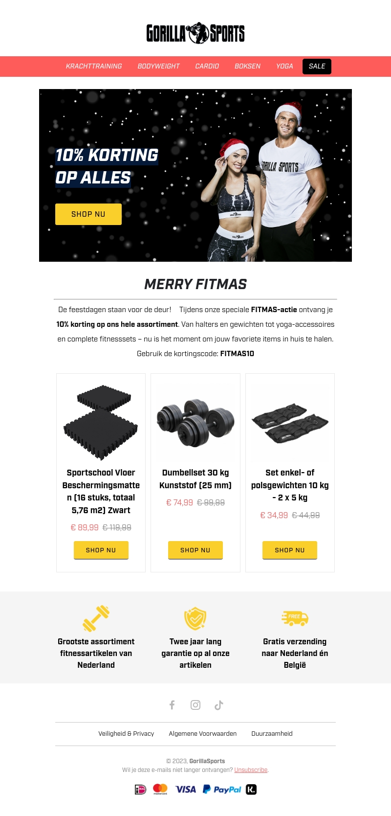 De feestdagen zijn in aantocht en Gorilla Sports viert dit met een speciale Fitmas-actie. Profiteer van 10% korting op het volledige assortiment, van halters en gewichten tot yoga-accessoires en complete fitnesssets. Mis deze kans niet om jouw favoriete producten aan te schaffen. Gebruik de kortingscode FITMAS10 om te genieten van deze unieke aanbieding.