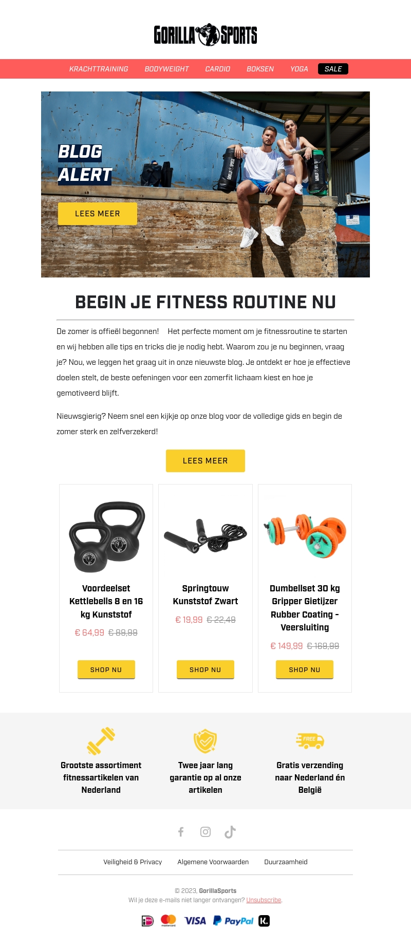 De zomer is hier! Het perfecte moment om je fitnessroutine te starten. Onze blog geeft je alle tips en tricks die je nodig hebt om effectief te trainen en je doelen te bereiken. Ontdek onze aanbiedingen voor kettlebells, springtouwen en dumbbellsets. Start je fitnessreis met zelfvertrouwen!