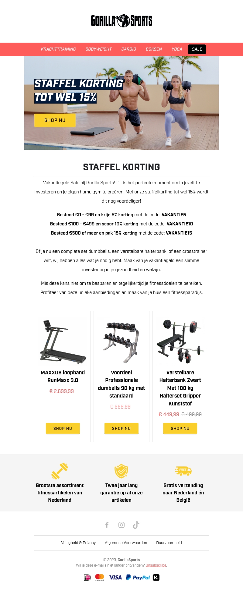 Profiteer van de Gorilla Sports Vakantiegeld Sale en ontvang tot wel 15% korting op je aankopen. Investeer in je eigen home gym met kortingen die oplopen tot 15%. Gebruik de code VAKANTIE5, VAKANTIE10, of VAKANTIE15 afhankelijk van je bestedingsbedrag. Verlies deze unieke kans niet om te besparen en je fitnessdoelen te bereiken.
