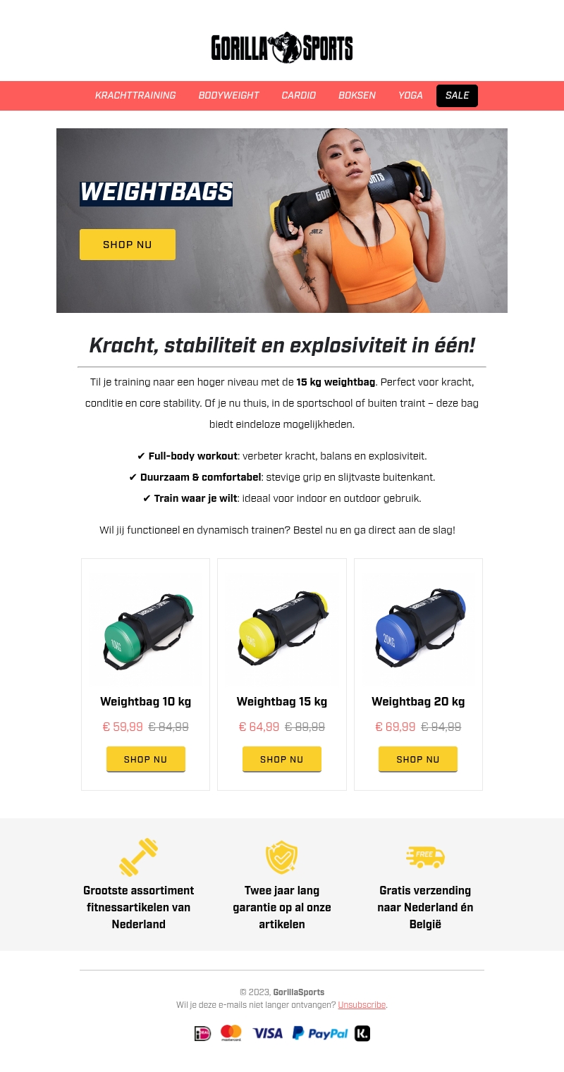 Til je training naar een hoger niveau met de Gorilla Sports Weightbags. Deze gewichtzakken zijn perfect voor het verbeteren van kracht, balans en explosiviteit. Of je nu binnen, buiten of in de sportschool traint, de weightbags bieden eindeloze mogelijkheden. Ze zijn duurzaam en comfortabel, met een stevige grip en slijtvast materiaal. Beschikbaar in diverse gewichten voor elk niveau.