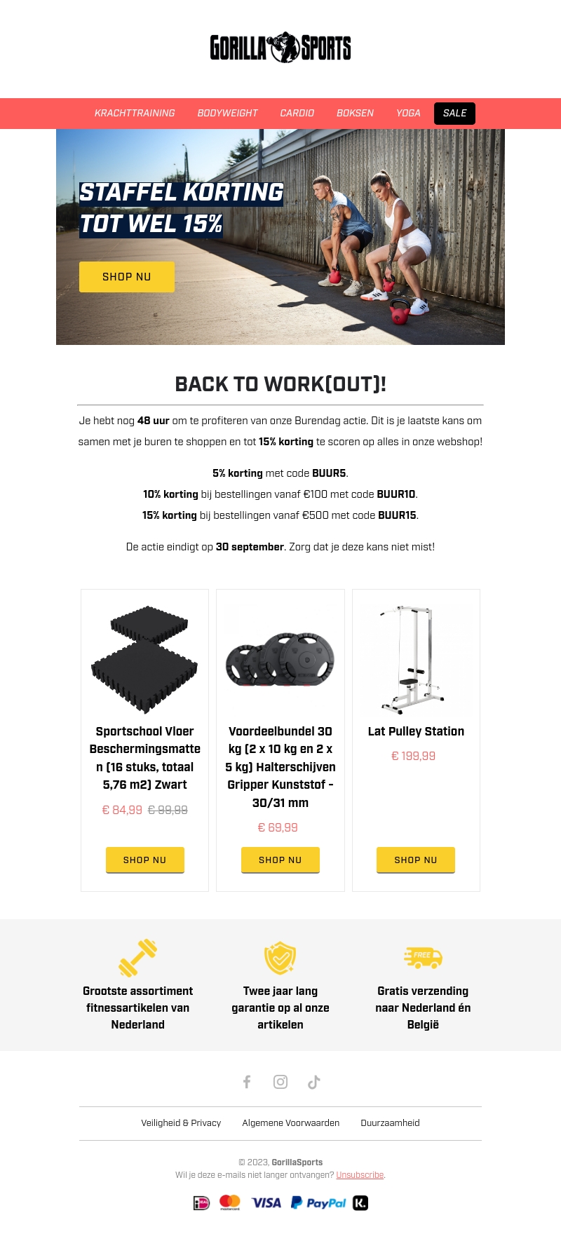 Je hebt nog 48 uur om te profiteren van onze Burendag actie bij Gorilla Sports. Dit is je laatste kans om samen met je buren te shoppen en tot 15% korting te scoren op alles in onze webshop! Gebruik de kortingscodes BUUR5, BUUR10 of BUUR15 afhankelijk van je bestelling.