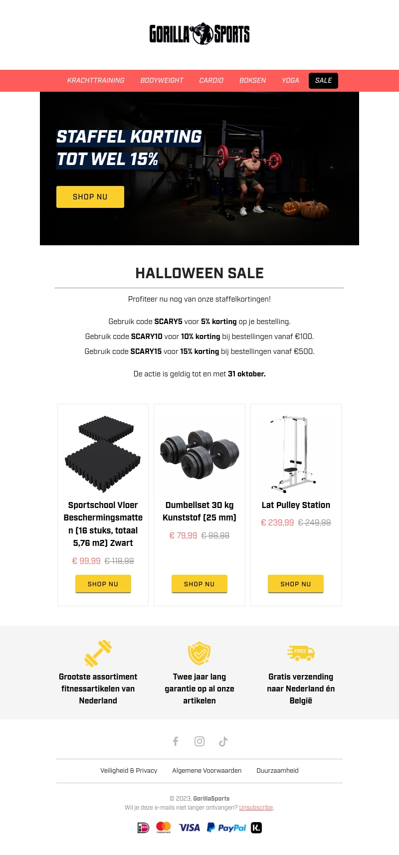Grijp je kans tijdens de Gorilla Sports Halloween Sale! Ontvang tot wel 15% korting op je favoriete fitnessartikelen. Gebruik onze kortingscodes SCARY5, SCARY10 en SCARY15 voor extra besparingen. Actie geldt tot en met 31 oktober. Mis het niet en shop nu!