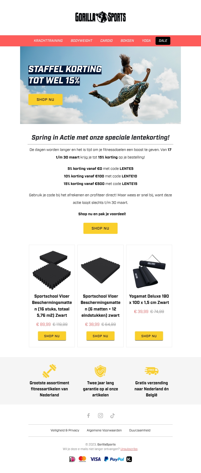 Deze lente biedt Gorilla Sports tot 15% korting op een breed scala aan fitnessproducten. Gebruik de kortingscodes LENTE5, LENTE10 of LENTE15 en boost je sportdoelen. Wees er snel bij, de actie loopt tot 30 maart. Ontdek ons aanbod en grijp je voordeel nu. Gratis verzending naar Nederland en BelgiΓ«.
