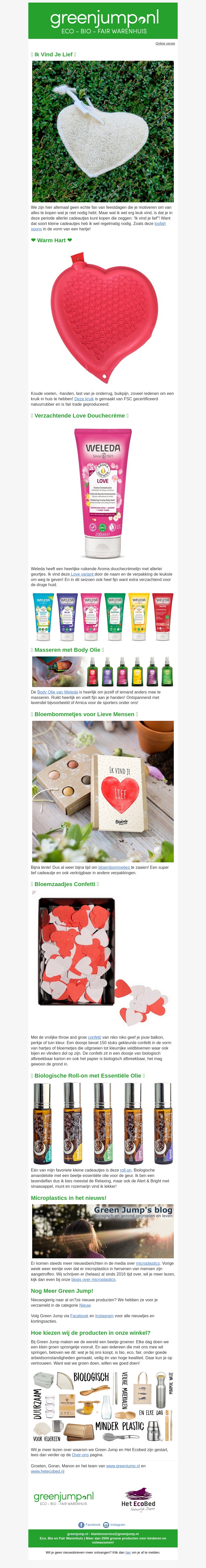 Welkom bij Green Jump's nieuwste collectie waarin liefde en duurzaamheid samenkomen. Van hartvormige sponzen tot biologische verzorgingsproducten, er is voor ieder wat wils. Ontdek de Love Douchecrème van Weleda en geniet van een verfrissende ervaring. Verwen jezelf of je geliefde met natuurlijke en eerlijke producten. Perfect voor Valentijnsdag of gewoon zomaar. Bezoek onze website om meer te ontdekken!