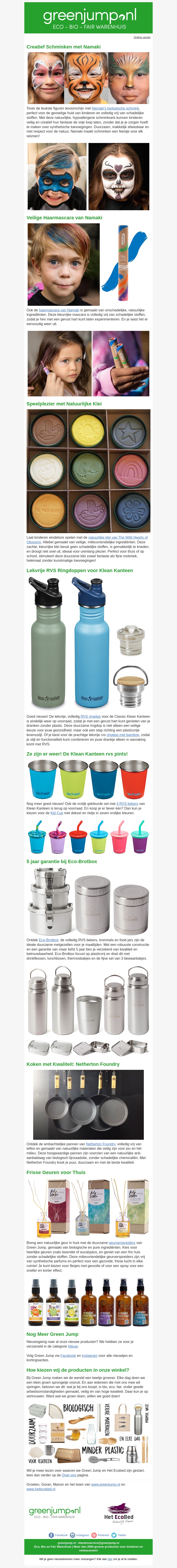 In deze nieuwsbrief ontdekt u de nieuwste ecologische en veilige producten van Green Jump. Verken creatieve schminksets, herbruikbare drinkflessen, en milieuvriendelijke keukenaccessoires. Speciale aandacht voor kindergerichte producten zoals speelkleuren met natuurlijke klei. Ontdek ook onze tips voor minder plastic in de keuken. Lees verder voor meer informatie en verbazingwekkende aanbiedingen.