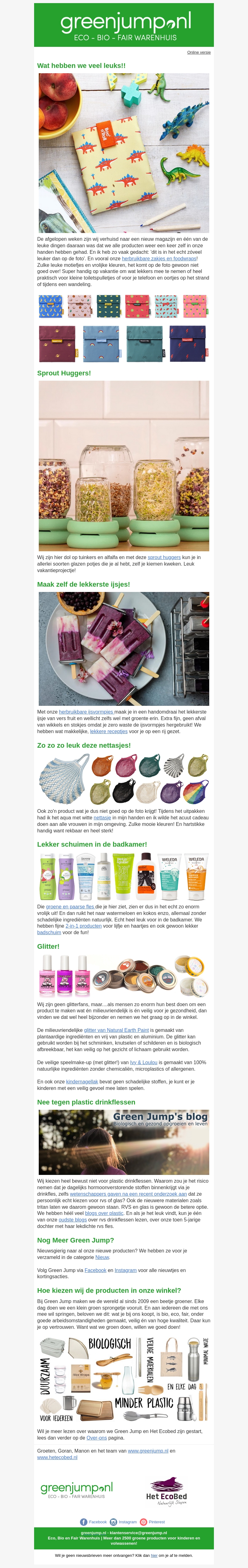 Welkom bij het laatste nieuws van Green Jump! Ontdek onze nieuwe producten zoals sprout huggers en herbruikbare ijsvormpjes. Lees alles over onze zero-waste filosofie en krijg handige tips voor een plasticvrij leven. Mis ook onze kortingsacties niet en blijf op de hoogte via onze sociale media kanalen. Ontdek het nu!