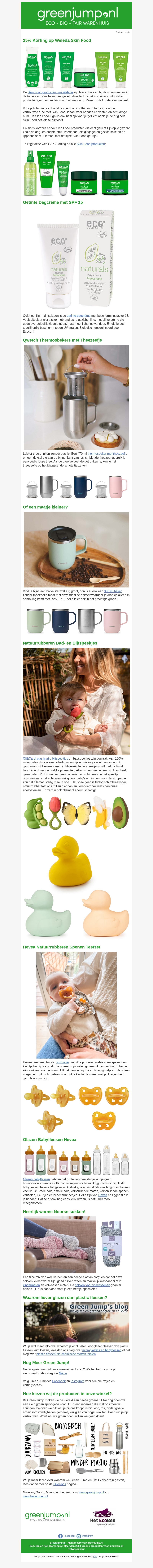 Green Jump biedt een breed scala aan duurzame producten. Profiteer nu van kortingen op Weleda Skin Food en ontdek onze eco-vriendelijke thermosbekers. Vergeet niet de houdbare siliconen items en kindvriendelijke accessoires te bekijken. Zorg goed voor jezelf en het milieu met onze selectie.