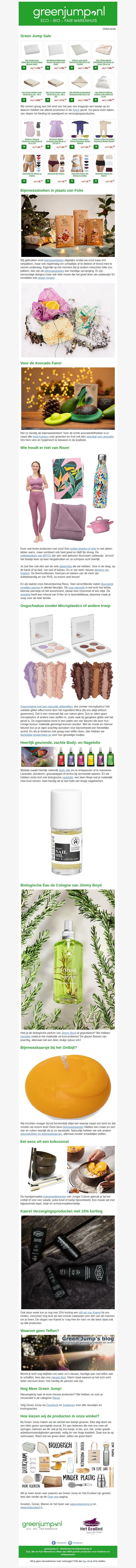De nieuwe nieuwsbrief van Green Jump staat vol met aanbiedingen op duurzame producten. Van eco-vriendelijke verzorgingsproducten tot comfortabele kleding, er is voor ieder wat wils. Laat je inspireren door de nieuwste duurzame trends en profiteer van aantrekkelijke kortingen. Mis het niet en blijf groen!