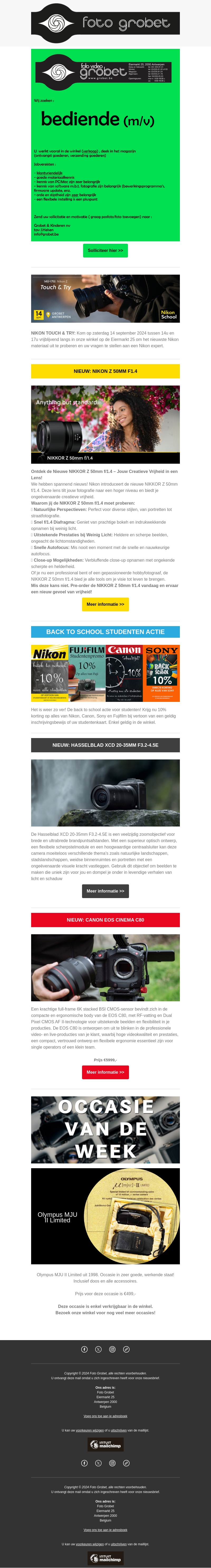 Bekijk de nieuwste vacatures bij Foto Grabet en ontdek de gloednieuwe Nikon Z 50mm F1.8 lens. Mis ook de 'Back to School' studentenkorting niet! Meer informatie over de Canon EOS Cinema C70 en onze 'Occasie van de Week' - Olympus MJU II Limited.
