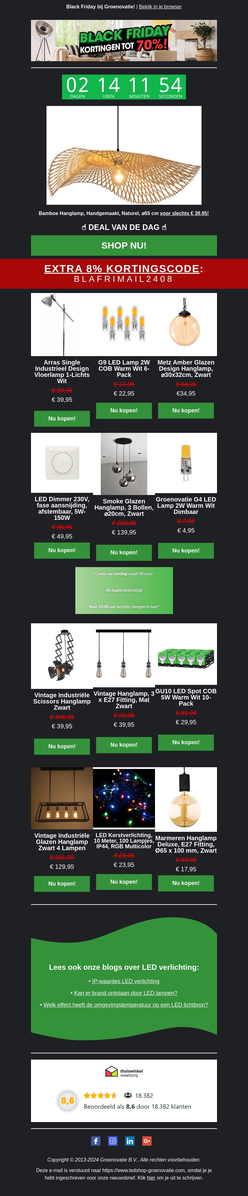 Profiteer van geweldige Black Friday aanbiedingen op LED verlichting bij Groenovatie. Ontvang tot 70% korting op diverse lampen en accessoires. Mis de Deal van de Dag niet en gebruik de extra kortingscode voor nog meer voordeel. Lees ook onze blogs voor handige tips over LED verlichting.