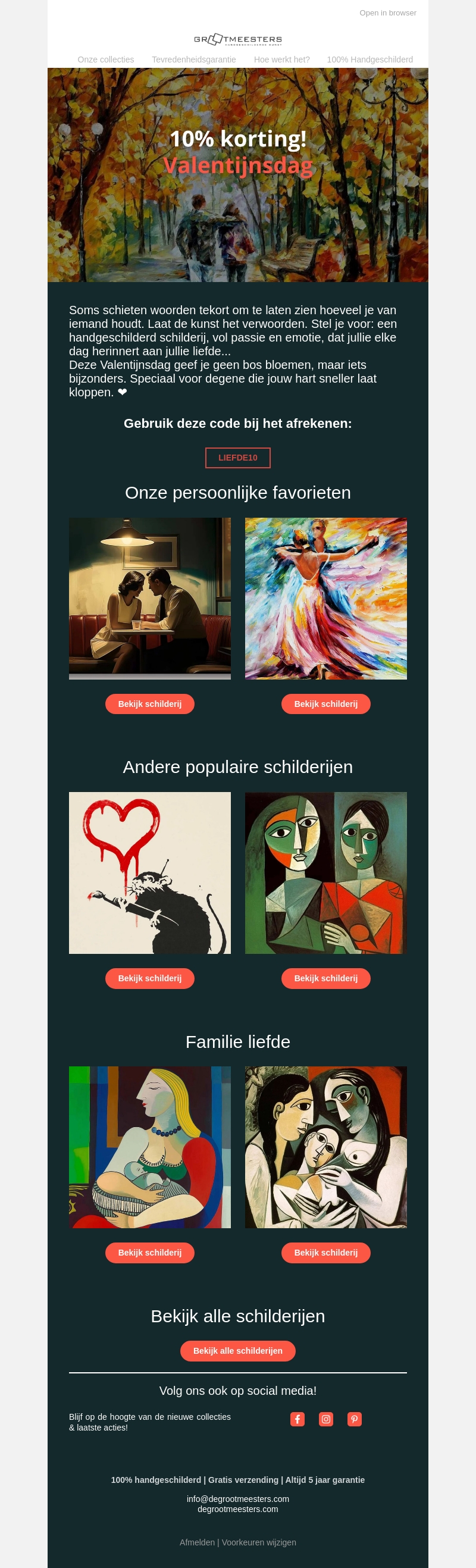 Ontdek unieke handgeschilderde kunstwerken en speciaal geselecteerde favorieten voor Valentijnsdag. Gebruik de kortingscode LIEFDE10 voor 10% korting. Breng passie en emotie in je huis met deze bijzondere schilderijen. Perfect voor een cadeau vol liefde.
