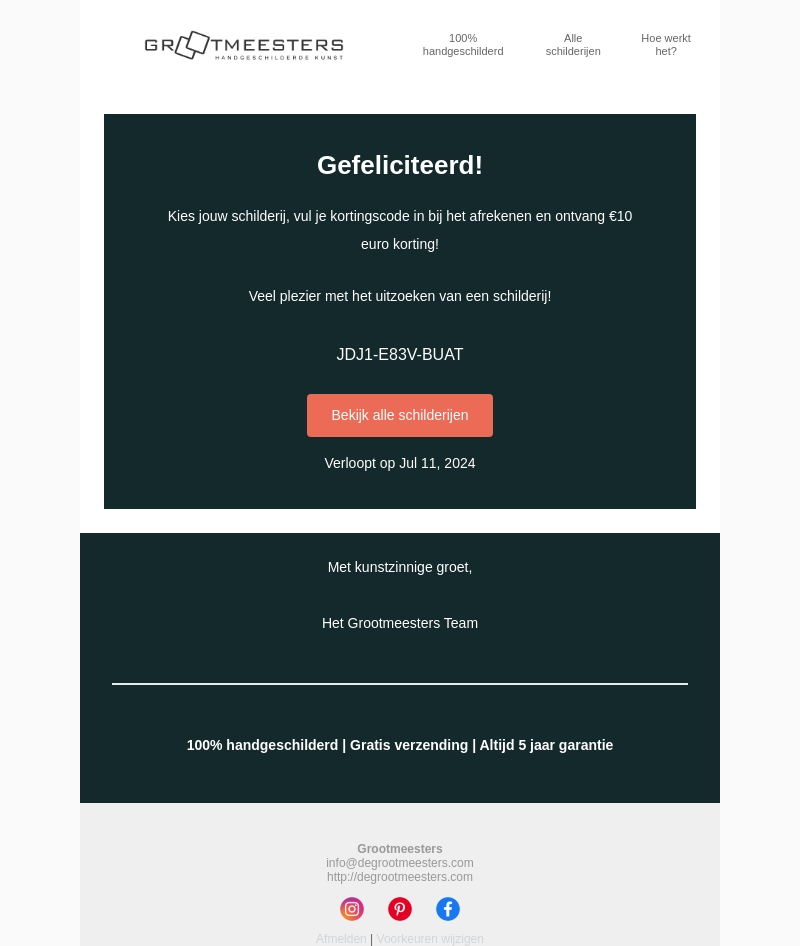 Gefeliciteerd! Kies nu jouw schilderij en ontvang €10 korting met de kortingscode. Verlopen op 11 juli 2024. Bekijk alle schilderijen op Grootmeesters.