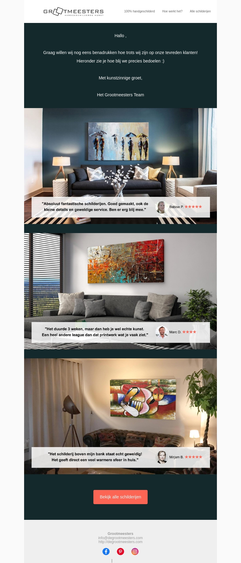 Wij zijn ontzettend trots op de tevredenheid van onze klanten. Bekijk hieronder wat ze te zeggen hebben over onze schilderijen en klantenservice. Ontdek hoe onze kunstwerken hun interieur verrijken.