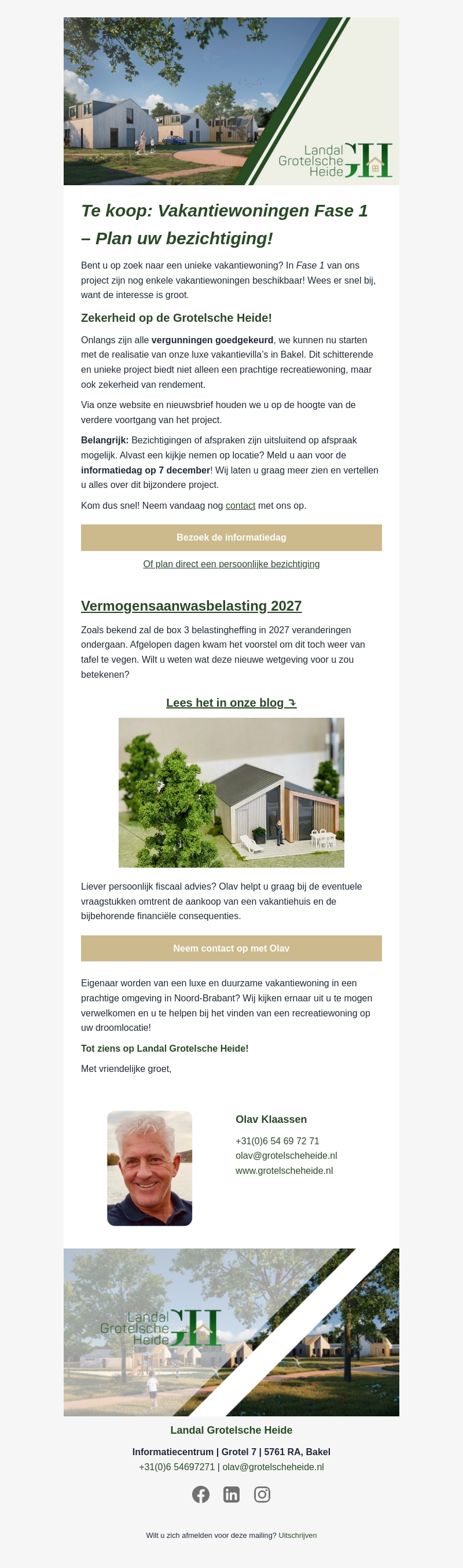 Bent u geïnteresseerd in een unieke vakantiewoning? Landal Grotesche Heide begint met de bouw van luxe villa's in Bakel. Kom naar onze informatiedag op 7 december en ontdek alles over dit project. Meld u snel aan voor een bezichtiging en verzeker uzelf van comfort en rendement.