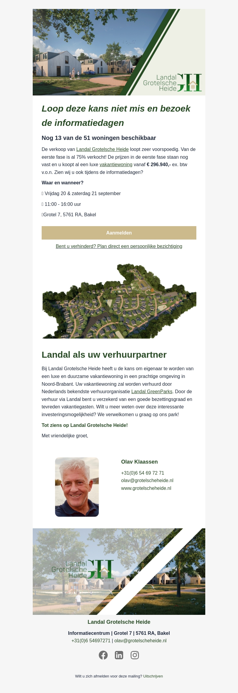 De verkoop van Landal Grotelsche Heide gaat snel. Nog 13 van de 51 woningen zijn beschikbaar. Prijzen beginnen bij €296.940. Bezoek ons tijdens de informatiedagen op vrijdag 20 en zaterdag 21 september van 11:00 tot 16:00 uur.