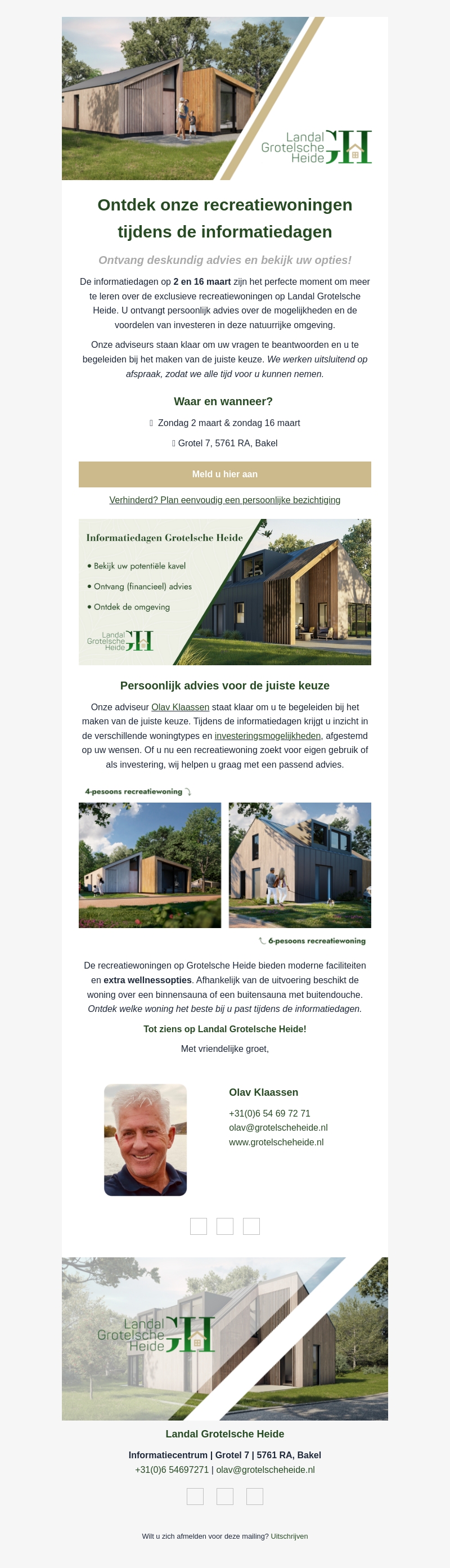 Kom naar de informatiedagen bij Landal Grotelsche Heide op 2 en 16 maart. Hier ontdekt u alles over onze exclusieve recreatiewoningen. Ontvang persoonlijk advies over uw investeringsmogelijkheden en welnes opties. Onze adviseurs staan klaar om u te helpen bij het kiezen van de juiste woning.