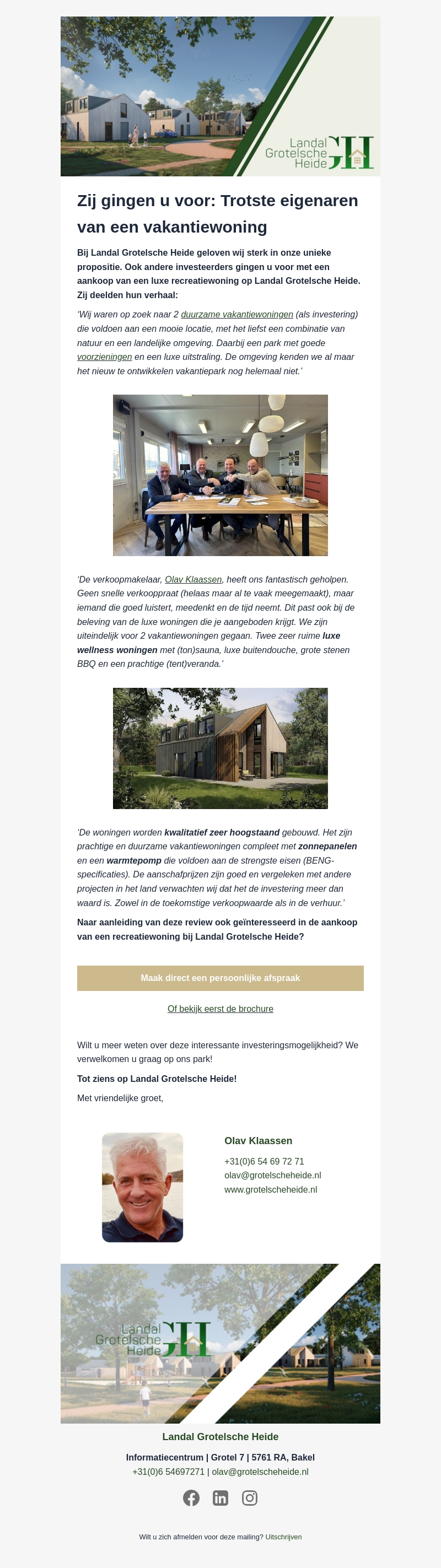 Bij Landal Grotelsche Heide worden dromen werkelijkheid. Word een trotse eigenaar van een luxe vakantiewoning op een prachtige locatie. De woningen zijn duurzaam en voorzien van hoogwaardige faciliteiten zoals zonnepanelen en warmtepompen. Dankzij makelaar Olav Klaassen en zijn deskundige begeleiding, kunt u rekenen op een persoonlijke ervaring. Ontdek de mogelijkheden om te investeren in een recreatiewoning die tijdloos comfort biedt.