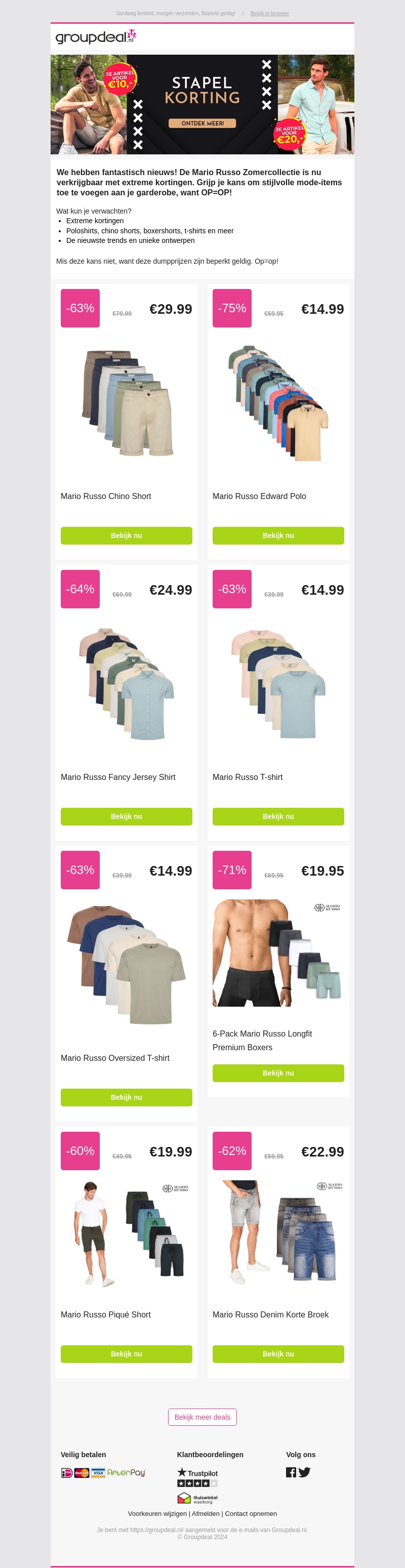 Ontdek de Mario Russo zomercollectie met exclusieve dumpprijzen! Van shorts en t-shirts tot boxershorts en meer, alles met extreme kortingen. Voeg stijlvolle mode-items toe aan je garderobe voordat ze op zijn.