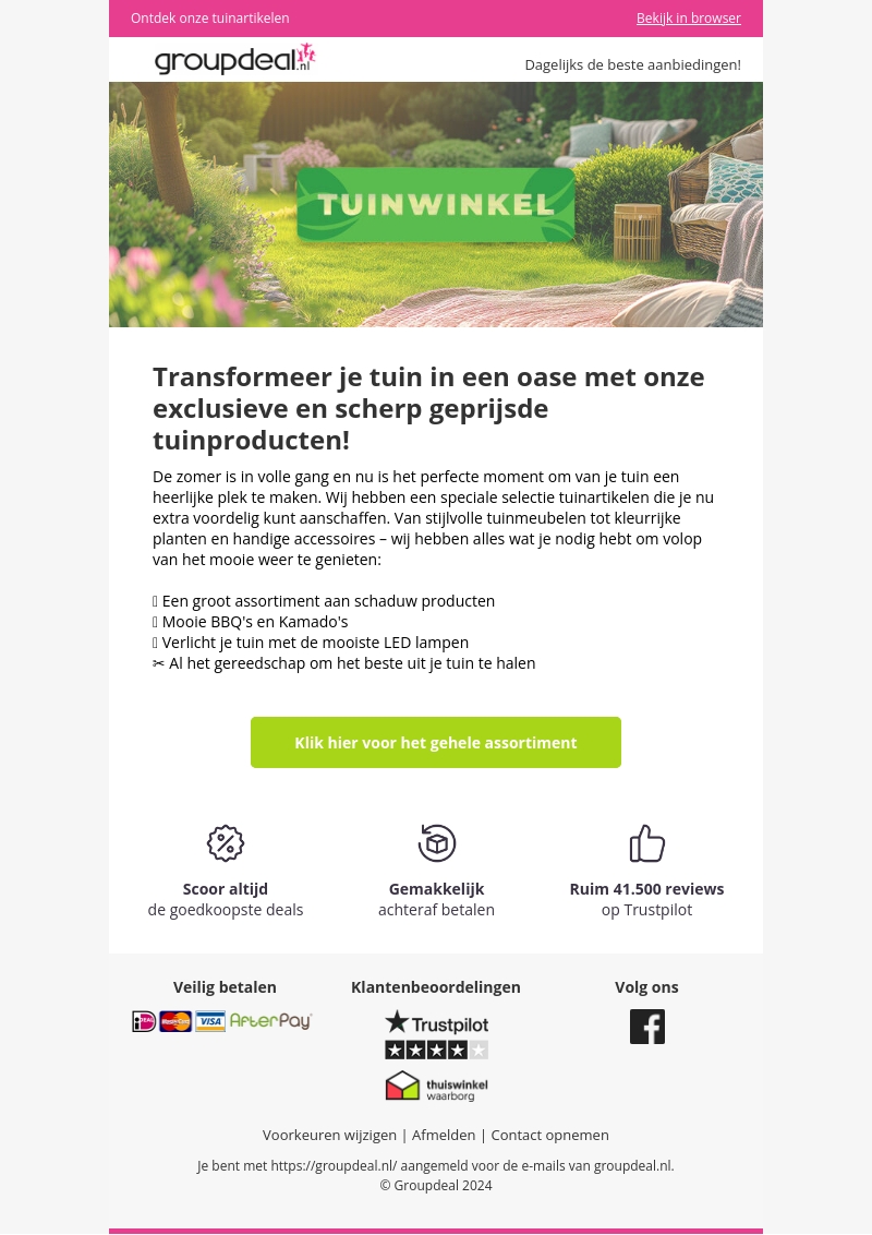De zomer is in volle gang en nu is het perfecte moment om van je tuin een heerlijke plek te maken. Ontdek onze speciale selectie tuinartikelen die je nu extra voordelig kunt aanschaffen. Van stijlvolle tuinmeubelen tot kleurrijke planten en handige accessoires - wij hebben alles wat je nodig hebt om volop van het mooie weer te genieten.