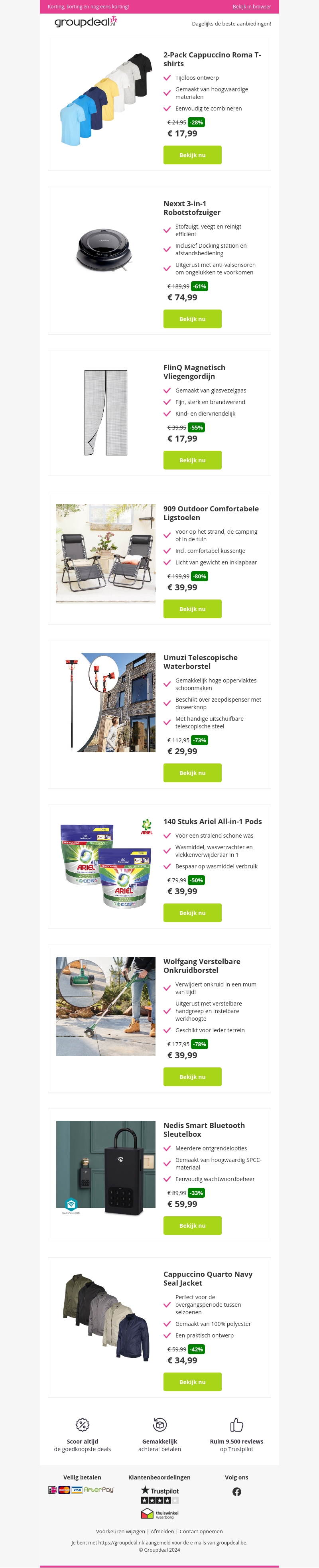 Profiteer van geweldige kortingen op onze nieuwste producten. Koop nu 2-Pack Cappuccino Roma T-shirts vanaf €17,99, Nexxt 3-in-1 Robotstofzuiger vanaf €74,99 en FlinQ Magnetisch Vliegengordijn vanaf €17,99. Mis deze aanbiedingen niet!