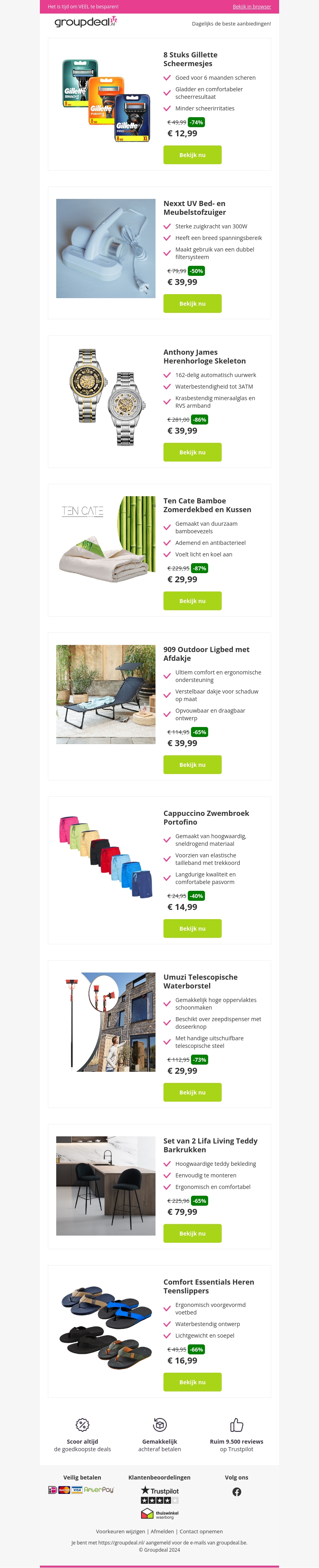 Bekijk de nieuwste aanbiedingen met geweldige kortingen! Van Gillette scheermesjes tot Nexxt UV stofzuigers en stijlvolle Anthony James Skeleton herenhorloges - we hebben alles wat je nodig hebt. Mis deze deals niet!