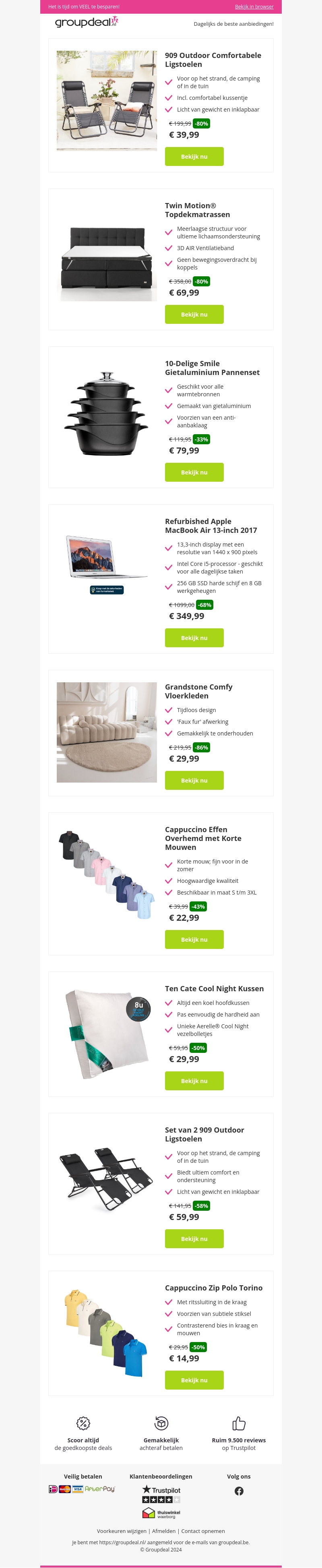 909 Outdoor Comfortabele Ligstoelen vanaf 39,99 | Twin Motion® Topdekmatrassen vanaf 69,99 | 10-Delige Smile Gietaluminium Pannenset vanaf 79,99